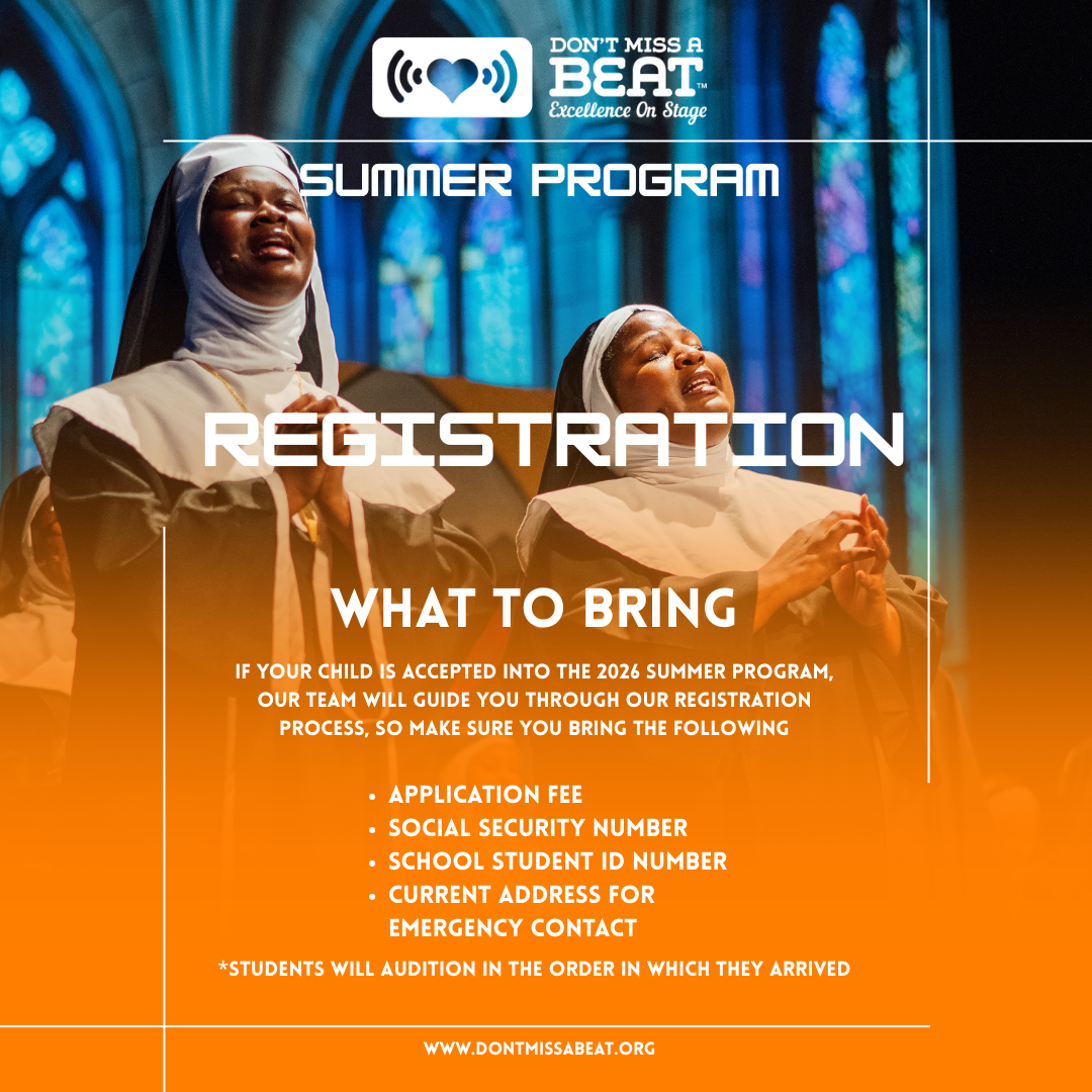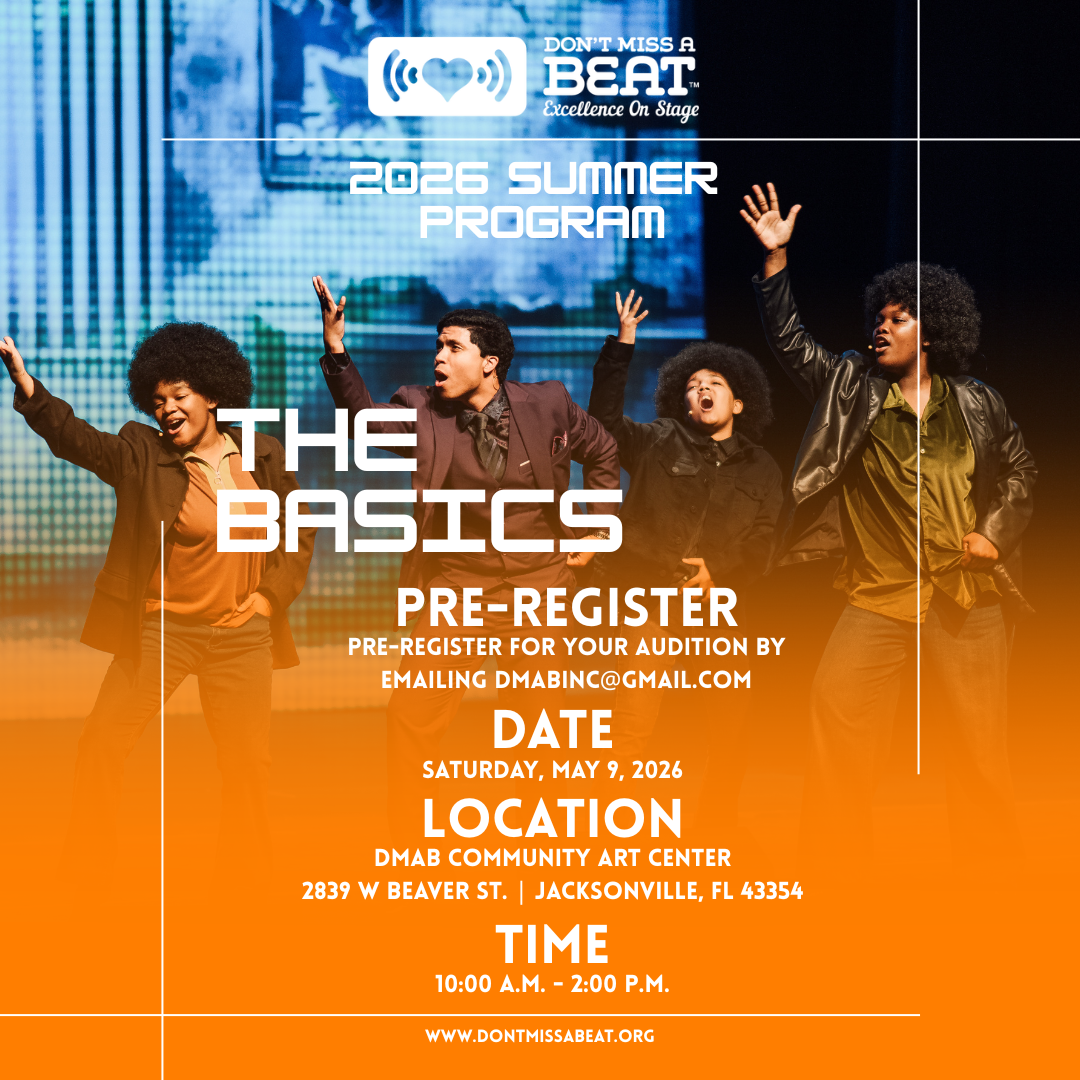Auditions for our 2026 Summer Program will be held on Saturday, May 9th from 10:00 a.m. until 2:00 p.m. at the Don’t Miss A Beat Community Art Center.